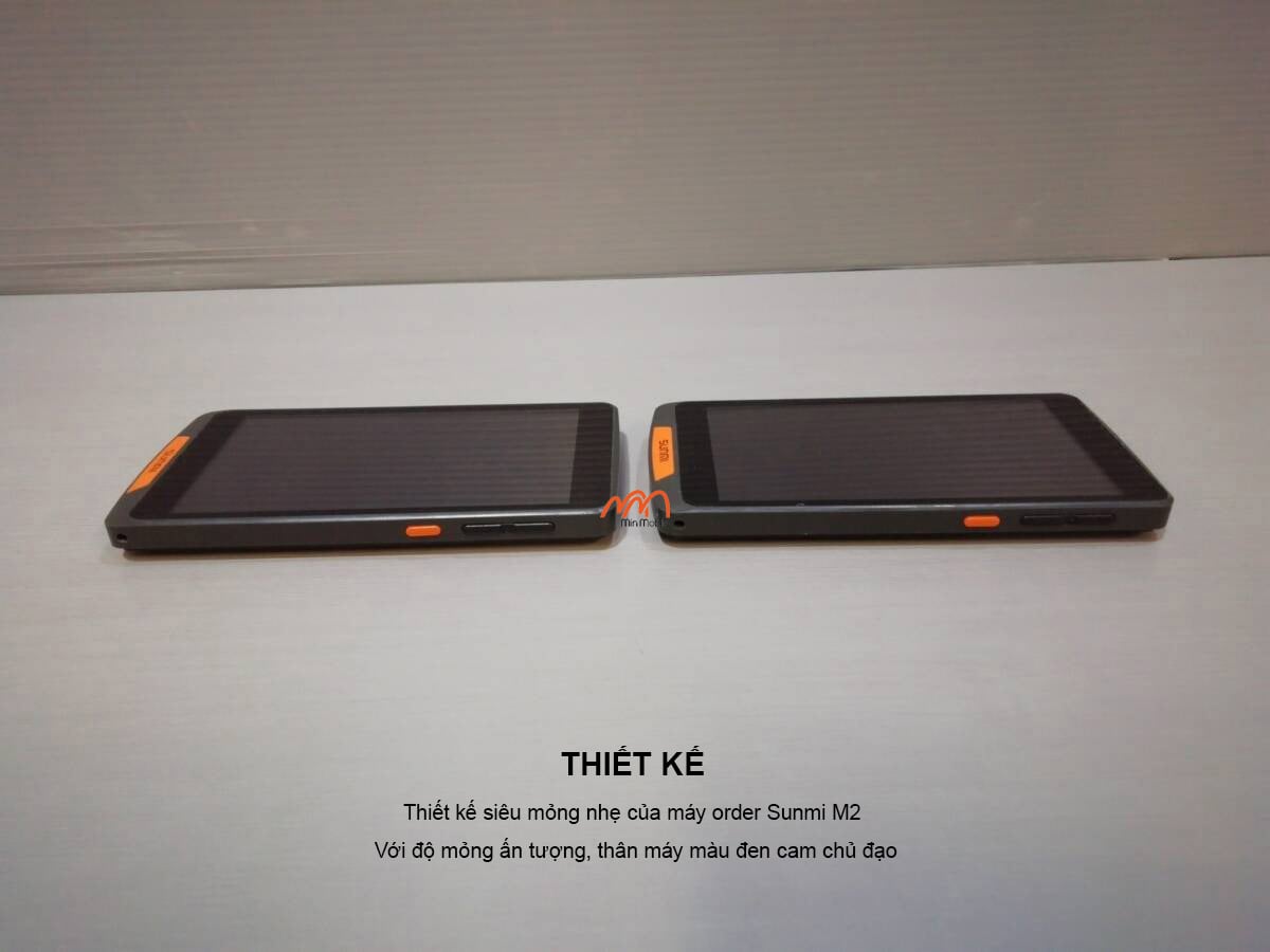 Khác với các dòng máy POS cục mịch, Sunmi M2 sở hữu ngôn ngữ thiết kế hiện đại với độ mỏng ấn tượng. Thân máy màu đen cam chủ đạo (hoặc đen toàn bộ tùy phiên bản) tạo cảm giác chuyên nghiệp. Trọng lượng siêu nhẹ giúp nhân viên phục vụ có thể cầm nắm bằng một tay, di chuyển liên tục trong ca làm việc mà không bị mỏi.