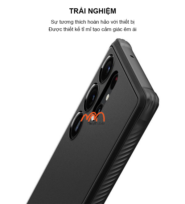 Khác với các dòng ốp lưng trong suốt hay màu mè, ốp lưng Spigen Rugged Armor khoác lên mình màu đen nhám (Matte Black) huyền bí. Điểm nhấn đắt giá nhất chính là hai dải Carbon Fiber (sợi carbon) ở phần trên và dưới mặt lưng. Chi tiết này không chỉ tạo nên vẻ ngoài sang trọng, hiện đại mà còn giúp chiếc điện thoại trông mạnh mẽ hơn, rất phù hợp với thiết kế vuông vức của dòng Ultra.
